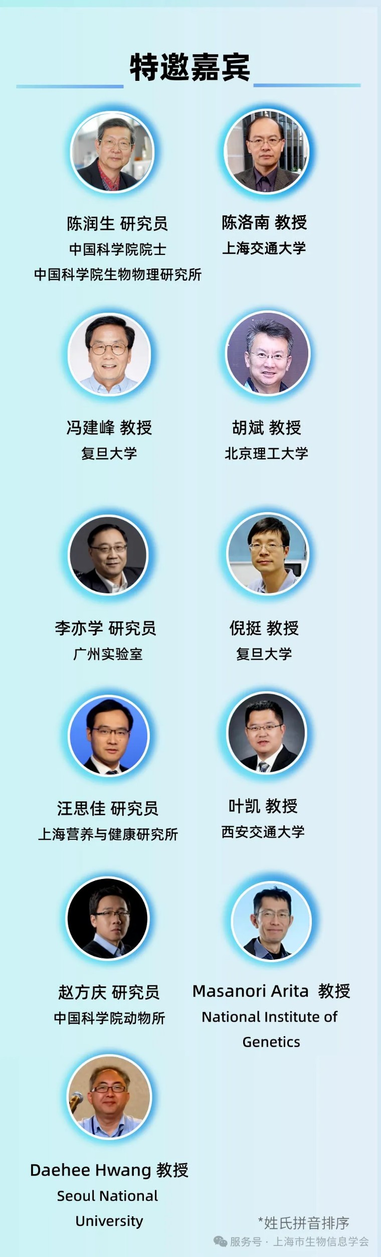 三、会议主题会议聚焦生命科学、医学、生物数字融合、人工智能、大数据等前沿交叉领域,拟邀请国内外知名科研院所、领军企业的专家学者出席,围绕生物信息学领域最新研究热点、技术突破与发展趋势,开展深度研讨与成果交流。会议设置了特邀报告、专业领域报告、墙报展示、博士生论坛、国际合作论坛等。本次年会已确定的特邀报告人包括陈润生院士、陈洛南教授、冯建峰教授、胡斌教授、李亦学研究员、倪挺教授、汪思佳研究员、叶凯教授、赵方庆研究员、Masanori Arita教授(日本)、Daehee Hwang教授(韩国)等。