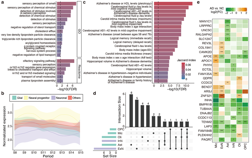 研究团队对上述41个关联SNP进行了基于基因位置的功能注释,共鉴定出174个与ES-Ana相关的候选基因,其中包括多种已知与AD相关的关键基因。功能富集分析显示,这些基因显著富集于AD相关生物学过程及疾病表型,进一步支持其在AD发生发展中的潜在作用。此外,通过分析这些基因在不同脑细胞类型中的表达特征,研究发现这些基因在脑衰老过程中,尤其是在胶质细胞中表现出持续性的表达下调,并在AD患者的胶质细胞中普遍呈现显著低表达。其中,多种AD相关差异表达基因(如APOE,TENM2)与脑内脂质代谢调控及神经发育过程密切相关。