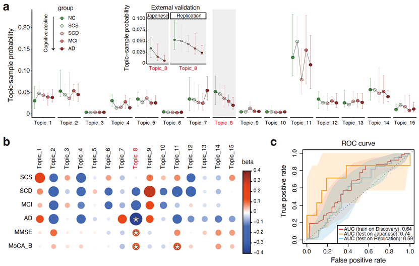 研究团队共收集了252例中国人的粪便样本和血液样本作为发现队列,并分别进行宏基因组测序和全基因组测序。研究对象涵盖了AD发展的5个阶段,包括:阿尔茨海默病(Alzheimer’s disease,AD)、轻度认知障碍(Mild Cognitive Impairment,MCI)、主观认知下降(Subjective Cognitive Decline,SCD)、主观认知症状(Subjective Cognitive Symptoms,SCS)及正常对照(Normal Control,NC)。研究团队采用潜在狄利克雷分配(latent Dirichlet allocation,LDA)主题模型对肠道微生物群落结构进行建模,将样本的菌群组成表征为15个肠道微生物社团特征。其中,Topic_8菌群社团丰度随着AD病程进展呈持续下降趋势。这一趋势在两个独立验证队列中得到了重复验证,包括一个自招募的中国人重复队列以及一个公开的日本人群队列,表明该关联模式具有良好的稳定性和鲁棒性。进一步分析发现,Topic_8社团中Anaerostipes属菌占比高达54%,为该菌群社团的主导菌属。因此,研究团队将该菌群特征命名为Anaerostipes富集型肠道特征(Anaerostipes-enriched enterosignature,ES-Ana)。