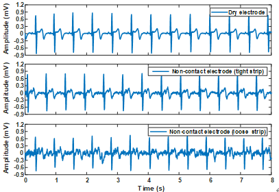 芯片采用0.18 μm CMOS工艺流片,核心面积1.7 mm²。在四通道工作模式下,整芯片功耗为121.8 μW,单通道前端功耗仅8.27 μW。实测表明,放大器在1 Hz与50 Hz下的输入阻抗分别超过142.8 GΩ与18.6 GΩ,并能容忍±350 mV的直流偏移。在使用干电极及非接触电极的实际心电测量中,信号波形清晰,QRS波群与T波特征明显,未见因电极阻抗较大导致的幅度衰减,验证了其在真实场景下的可靠性与高性能。