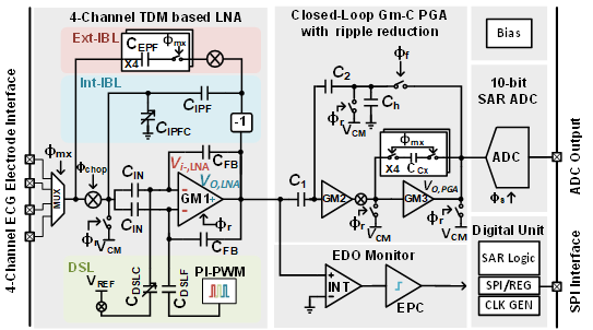 最后,通过时间复用架构与闭环跨导-电容可编程增益放大器的协同设计,实现了通道数与输入参考噪声的灵活权衡:支持1至4通道配置,对应噪声水平分别为0.28、0.35与0.40 μVrms,用户可根据具体应用在通道数量与信号质量之间进行优化选择。